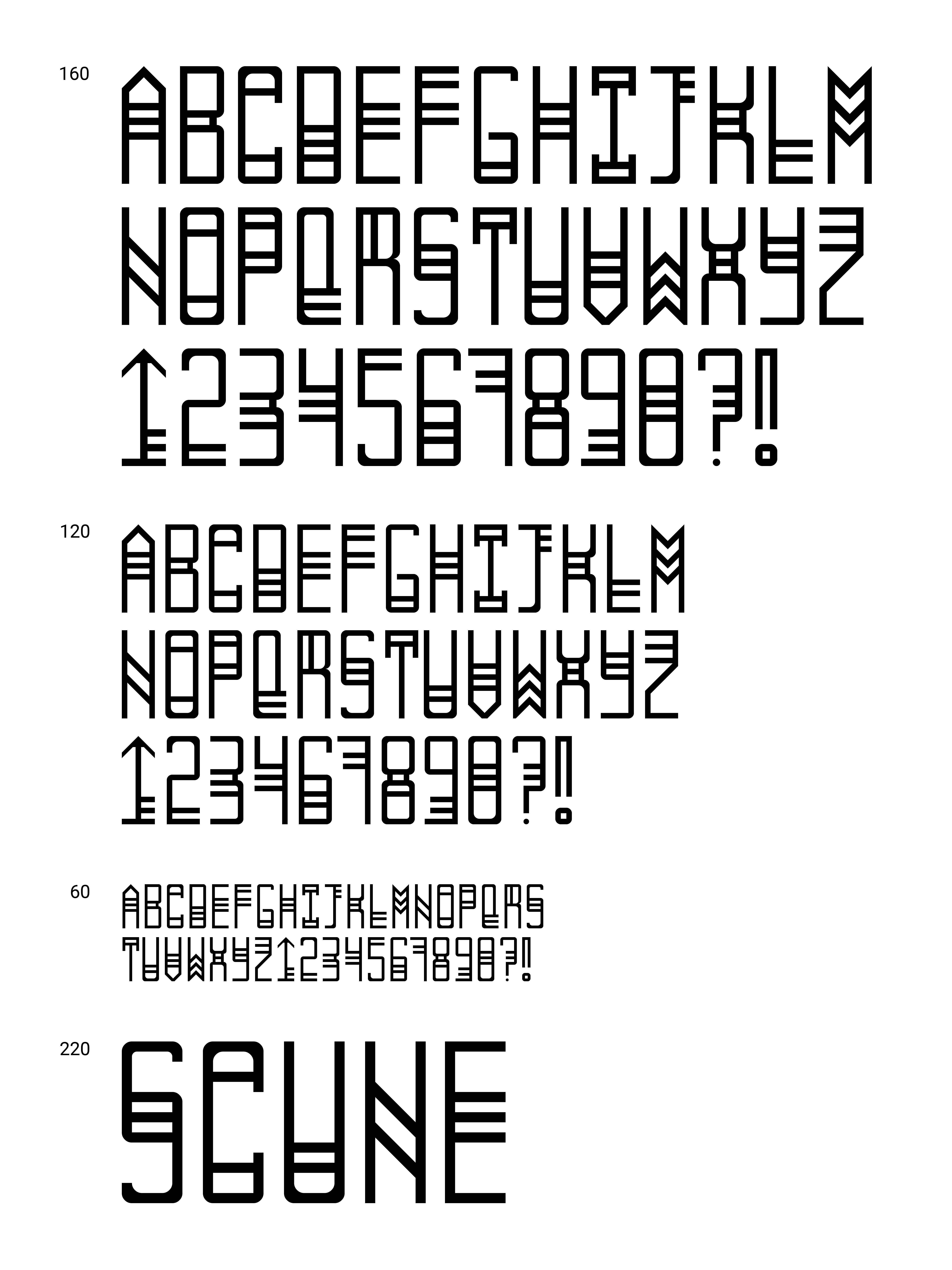Scune is a digital typeface created using FontStruct software. The name is a